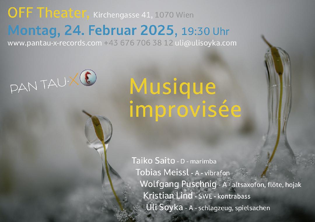 Die Ausnahme Vibrafonistin/Marimba-Spielerin Taiko Saito (lebt in Berlin) trifft auch österreichischen Jungmeister Tobias Meissl - Altmeister Wolfgang Puschnig, Uli Soyka mit Neuankömmling und Meister am Kontrabass Kristian Lind vervollständigen das IMPROVISATIONS-ENSEMBLE